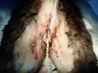 尿道栓子による尿道閉塞を起こした雄猫ちゃんに、尿道のバイパス手術を実施しました。筒状包皮粘膜弁を利用することで術後の合併症を少なくし、見た目も自然な感じになります。