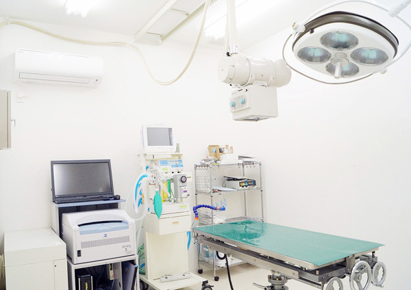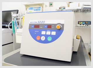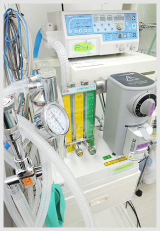 全身麻酔をかける時に、吸入麻酔薬を気化し酸素と同時に動物へ供給する機械。当院では、注射麻酔の他、麻酔中はガス麻酔で維持しているため、より安全で体への負担が少なく、麻酔からの覚醒も早いものを用いております。また、人口呼吸器は、換気回数、換気圧を設定でき、最も安全な環境で手術を行う事ができます。