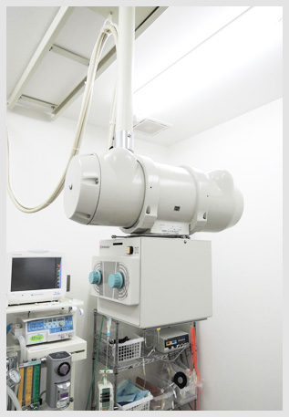 動物専用のX線照射器(レントゲン検査)です。各体格/撮影部位で適切なX線照射が可能なので、動物への負担は最低限で済みます。手術X線室の天井にスライド走行しており、ここからX線が発生して前述のデジタルX線システムとの組み合わせで実際のX線写真が作られます。当院では出力が高く大型犬の撮影でも充分な画質が得られる機器を使用しています。